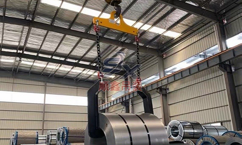 翻轉吊具通過機械剪力原理,對立式擺放的卷鋼進行單邊抓取,來完成卷鋼的裝卸,當改變重力點時,可以對卷鋼進行翻轉,作業(yè)時不傷鋼卷。其吊耳采用加厚處理,焊縫飽滿牢固、延長使用壽命。