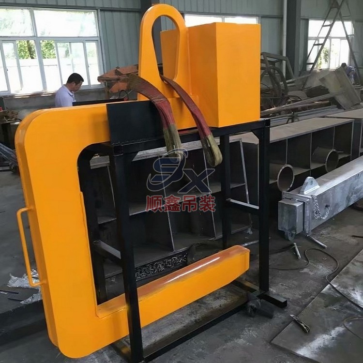C型吊具適用于鋼卷的水平吊運,由吊具體和配重鐵組成。主體部分由合金鋼和鋼管拼接而成,截面為箱型結構,配重鐵起調節(jié)吊具平衡的作用,使吊具和被吊物的重心在一條線內(nèi)。載荷范圍:3.2-32噸。